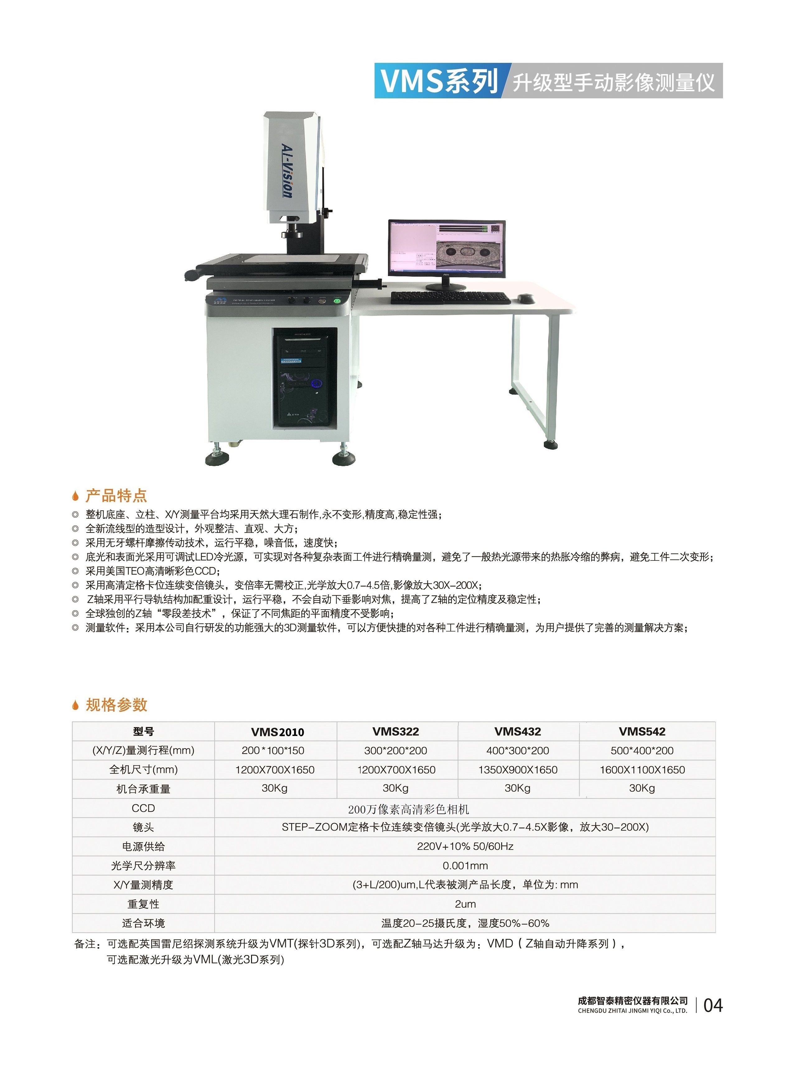 成都智泰精密仪器有限公司专注于精密测量仪器,人工智能,智能制造领域,专业从事智能视觉自动化检测解决方案的贸易型企业。公司成立于2011年,位于天府之国成都,现有行业精英十余人,办公仓储面积200余平米。 公司主要产品为精密光学影像测量仪,精密轮廓形状测量仪,精密机器人定位系统,精密智能视觉尺寸检测仪器,精密表面缺陷智能检测设备,工业工程特种机器人。 公司凭借过硬的技术实力和产品方案,率先进入智能视觉自动化检测领域,推广以精密智能视觉自动化检测为基础的机器人自动化应用,公司不断整合上下游的资源,拥有巨大的全产业链优势??突禾甯哺橇宋夜苤圃煲档亩嗍煊颍ê娇铡⒑教臁⒕?、汽车、新能源、光伏、食品,精密电子、精密机械、模具、PCB、LCD、五金、塑胶、医疗、教育、计量及科研院所等行业。 公司创新的产品能满足生产与制造行业客户的要求,训练有素的工程师能及时提供多种技术服务,如解...